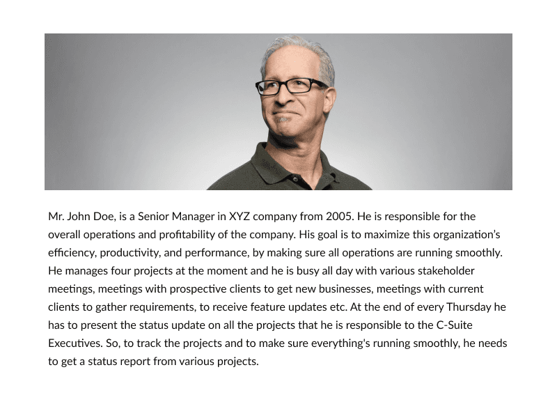 Senior Managers usually have bi-weekly meetings with the reporting managers to receive the status updates but they can be very busy because of the various new prospective clients/projects to meet with the managers for status update meetings. So, to get a bird’s eye perspective of the various projects and to know if they are facing any issues and to make sure all the projects are running smoothly and efficiently on time they would need to see high level information about the projects on the go.